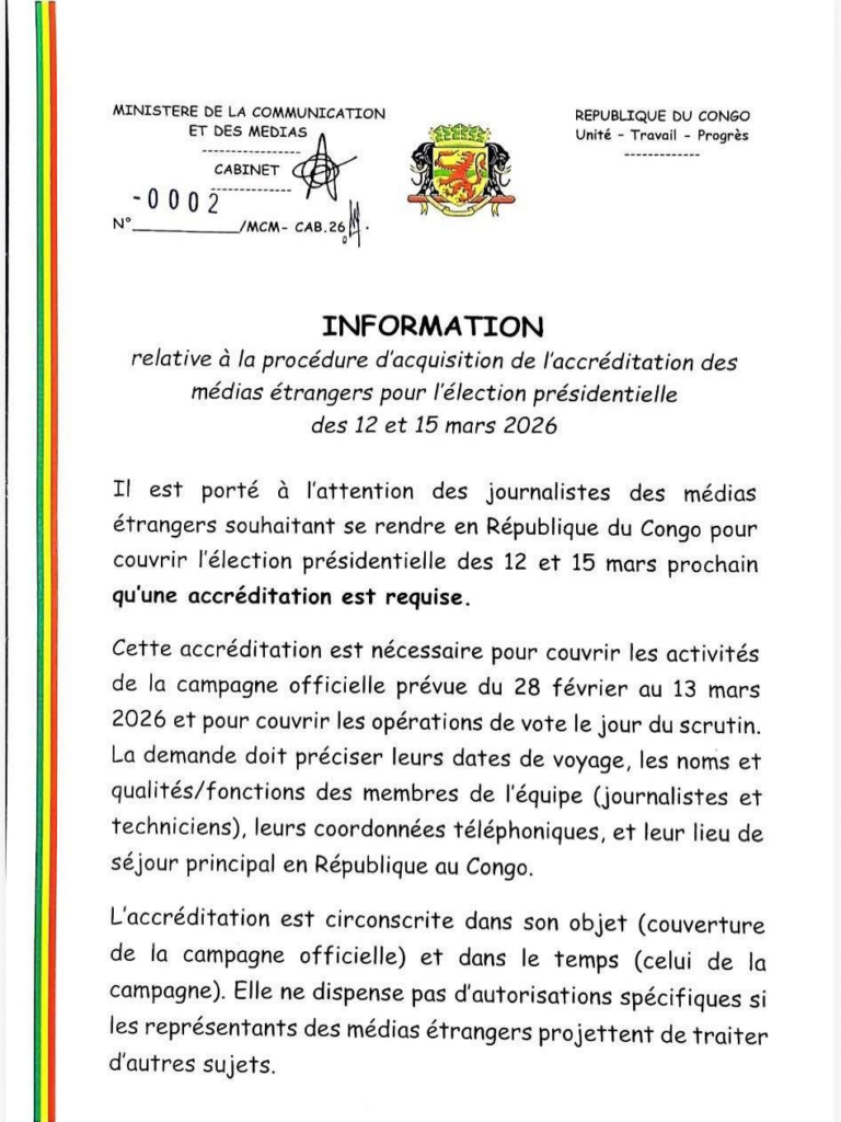 À l’approche de l’élection présidentielle de mars prochain, le Ministère congolais de la Communication annonce une mesure clé : tous les journalistes, nationaux comme internationaux, devront impérativement obtenir une accréditation officielle pour couvrir le scrutin. Une décision qui vise à garantir une organisation rigoureuse et une couverture médiatique professionnelle de cet événement majeur de la vie démocratique congolaise.