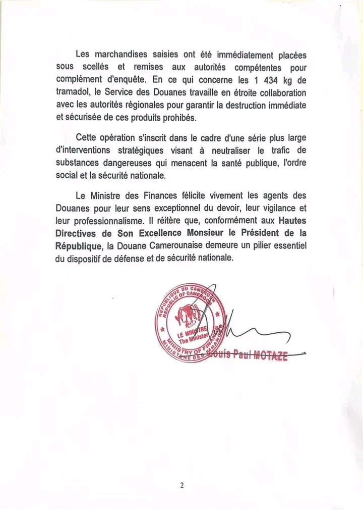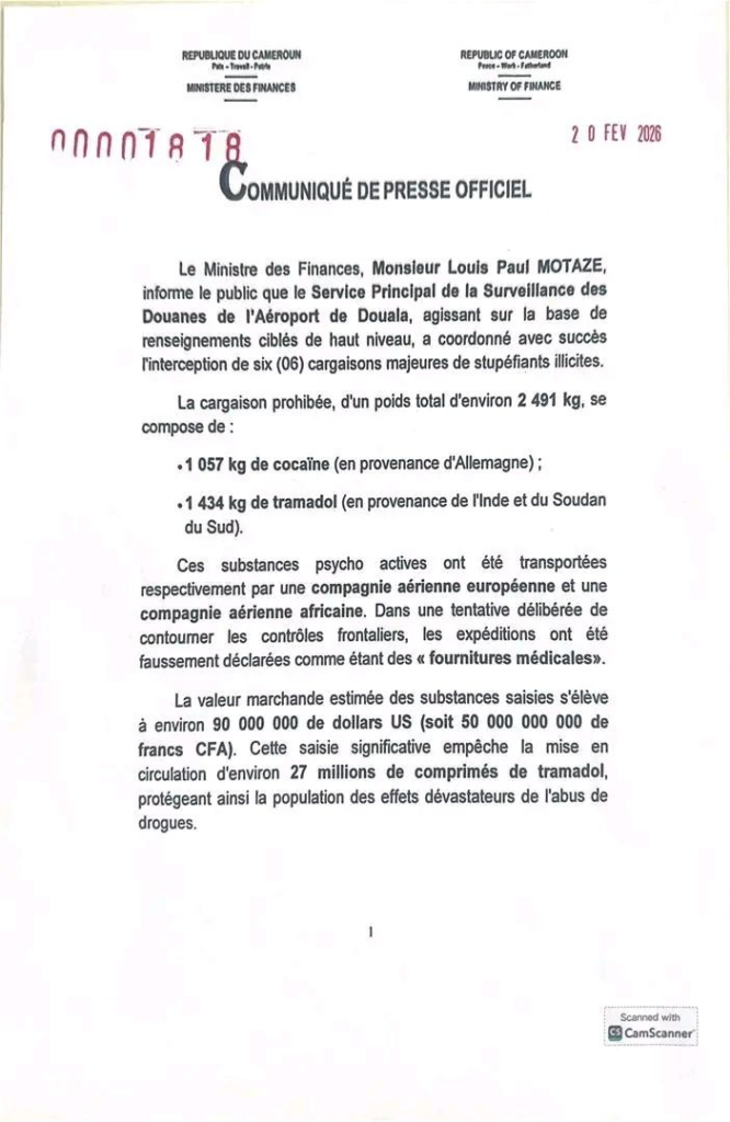 Selon ce communiqué du Ministre des Finances du Cameroun Louis Paul Motaze, la douane camerounaise a fait une saisie record de 2491 kgs de stupéfiants le 20 février 2026 à l’aéroport international de Douala. Ces cargaisons comprenaient : 1057 kg de cocaïne en provenance d’Allemagne et 1434 kg de tramadol en provenance de l’Inde et du Soudan.