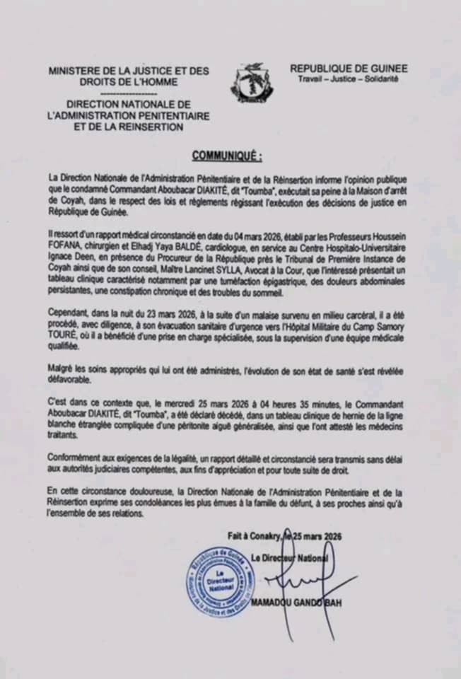 Sa santé se dégrade rapidement. Un rapport médical du 4 mars 2026, établi par des spécialistes du CHU Ignace Deen — l’hôpital de sa jeunesse — signale des douleurs abdominales, une constipation chronique et des troubles du sommeil. Dans la nuit du 23 mars, un malaise brutal impose son transfert en urgence à l’hôpital militaire. Sa famille, tenue à l’écart depuis son transfert, publie dans la journée du mercredi une demande officielle de preuve de vie. Elle arrive trop tard.